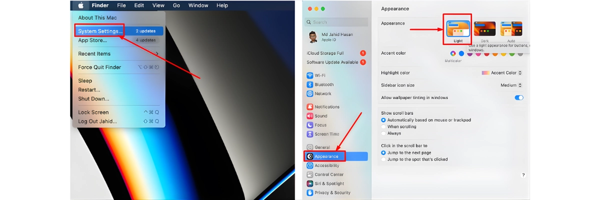 > Click on the “Light” option, to make your screen go from dark to light mode.
